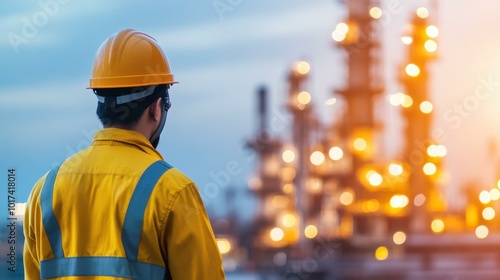 A skilled engineer in protective gear stands confidently at an oil refinery, surrounded by industrial machinery.