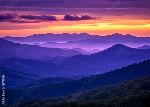 A sky filled with vibrant orange and purple hues during a sunset over the Blue Ridge Mountains, revealing layers of misty clouds against the colorful sky.