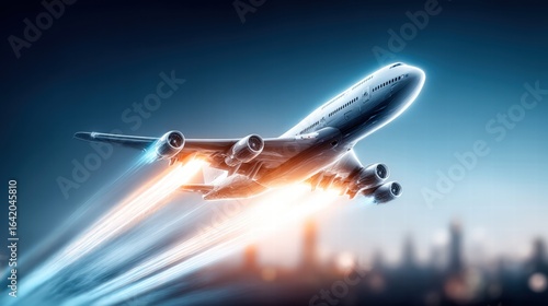 A sleek aircraft soaring through the sky above a vibrant, blurred cityscape.