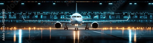 A sleek airplane is parked on a well-lit tarmac inside a modern airport hangar, showcasing advanced design and technology.