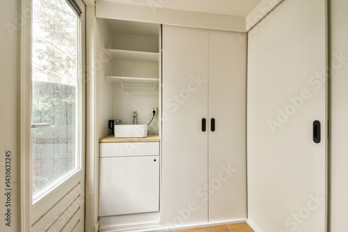 A sleek and modern laundry room featuring minimalist cabinetry and a bright, airy design. Ideal for small spaces, it combines functionality with style.