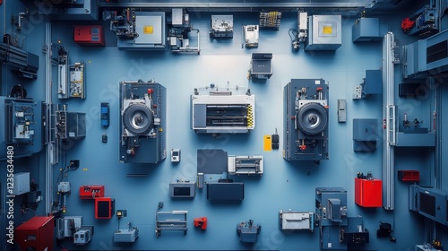 A sleek auto parts manufacturing facility with high-precision CNC machines, top-down view.