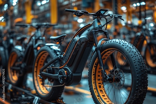 A sleek black electric bike with a large tire sits on an assembly line in a factory setting.