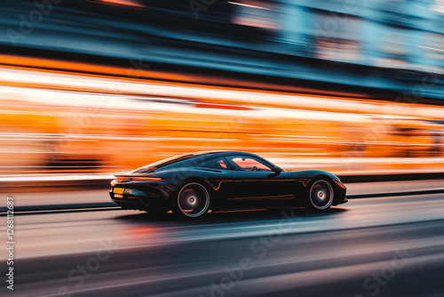 A sleek black luxury sports car speeds through an urban street at night, creating a motion blur effect with vibrant orange and blue city lights.