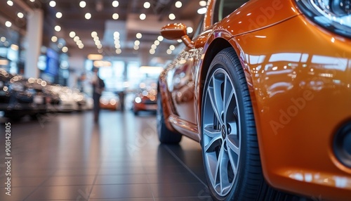 A sleek blue sports car is currently parked inside a bright car showroom for display purposes