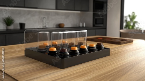 A sleek capsule coffee machine surrounded by different coffee pod flavors on a wooden counter.