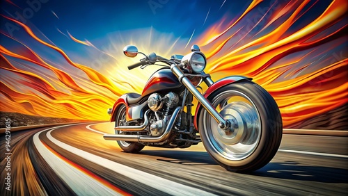 A sleek, chrome motorcycle speeds down a winding road, surrounded by stylized, colorful clipart flames and stripes, conveying freedom and adventure on the open highway.