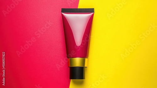 A sleek glossy crimson cosmetic tube with a gold accent sits centered on a vibrant split background of red and yellow