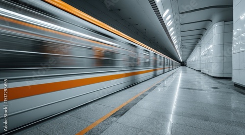 A sleek, grey and orange subway train speeds through a modern, brightly lit station with polished floors and white-tiled walls