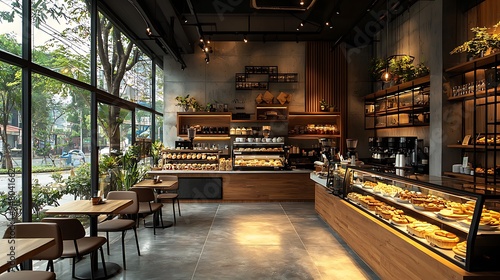 A sleek, modern coffee shop with glass display cases filled with tempting pastries.