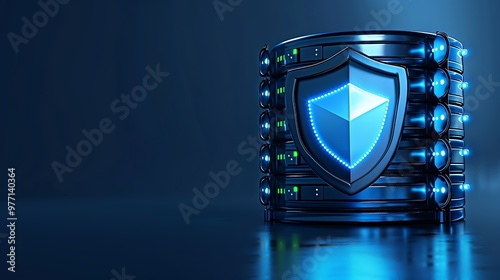 A sleek server with a digital shield symbolizes advanced cybersecurity and data protection in a modern tech environment.