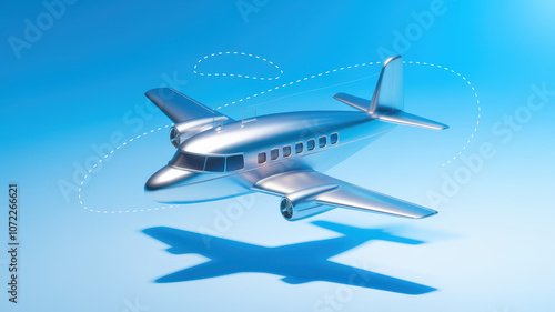 A sleek silver airplane model in mid-flight, showcasing its aerodynamic design against a serene blue background, evoking a sense of adventure and exploration.