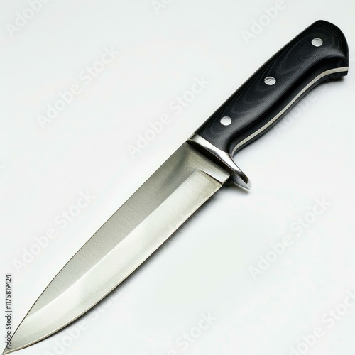 A sleek, stainless steel fixed blade knife with a black, textured handle.