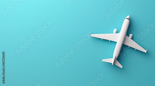 A sleek, white airplane is depicted from above against a vibrant turquoise background, emphasizing a modern design and travel theme.