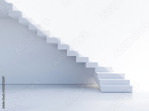 A sleek white staircase ascends peacefully to an unseen upper level, set against a smooth, light-colored wall in an empty, open space. The minimal decor evokes tranquility and simplicity