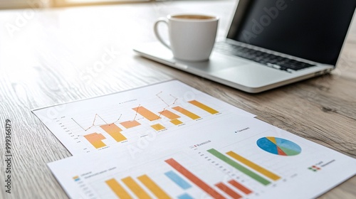 A sleek workspace equipped with visual data displays, a laptop, a notepad, and a coffee cup, designed for optimal focus and efficiency.