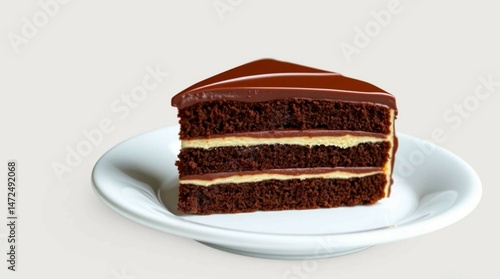 A slice of chocolate cake filled and topped with rich chocolate frosting, placed on a white plate, realistic food photography.
