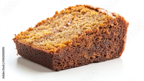 A slice of eggless banana cake on a white background