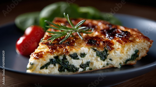 A slice of golden-brown frittata featuring spinach and feta cheese, adorned with rosemary, served on a contrasting plate for an appealing presentation.