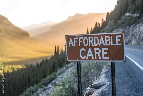 A slightly bent black metal sign with Affordable Care written in white block letters, positioned beside a winding mountain road with a scenic overlook