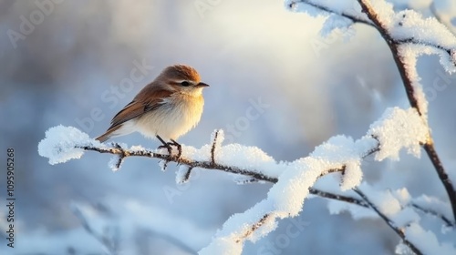 A small bird perched on a snow-covered branch, with its feathers fluffed up against the cold.