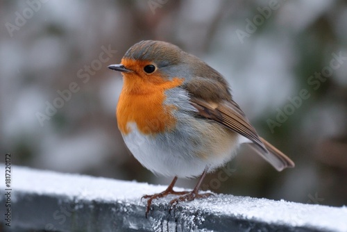 A small bird with bright orange and gray feathers sits on a snowy railing. The background shows hints of green foliage, creating a serene winter scene
