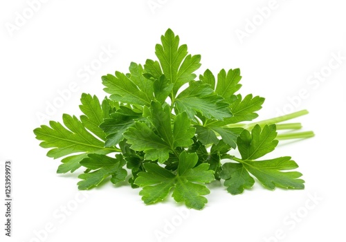A small bunch of vibrant green parsley leaves with crisp edges isolated on white background