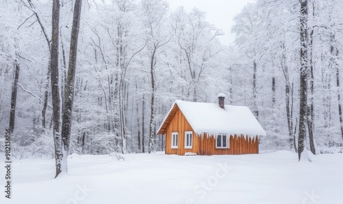 A small cabin in the woods is covered in snow
