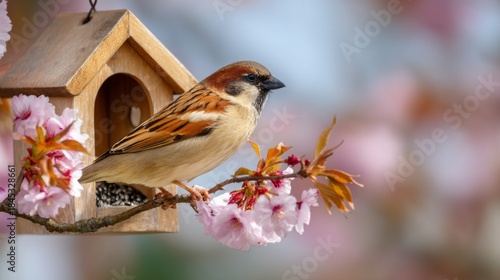 A small, colorful bird perches on a bird feeder, surrounded by delicate cherry blossoms in full bloom. The scene captures the joy of spring, filled with vibrant colors and life