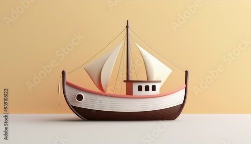 A small, decorative model ship with sails, set against a warm, plain background, showcasing a charming nautical design.