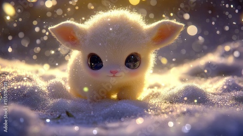 A small, fluffy, white creature sits in the snow.