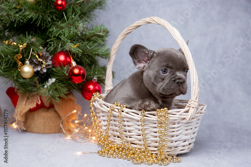a small French bulldog puppy in a basket on a New Year's background near the Christmas tree