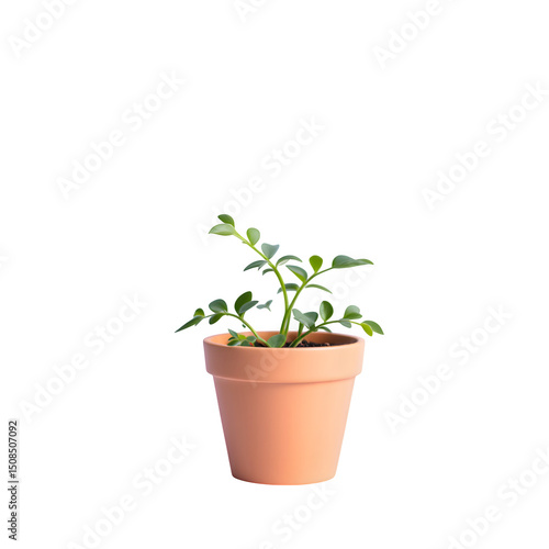 A small green leafy plant growing in a terracotta pot against a plain black studio background scene view isolated with white background