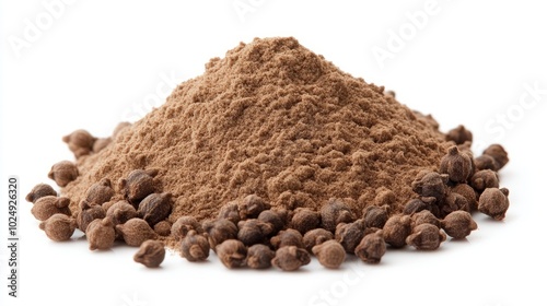 A small heap of ground allspice powder with whole berries