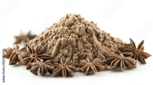 A small heap of ground anise seed powder with whole anise seeds scattered nearby, isolated on a white background
