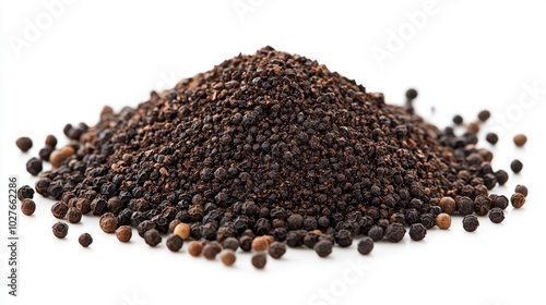 A small heap of ground black pepper with whole peppercorns nearby, scattered on a white background