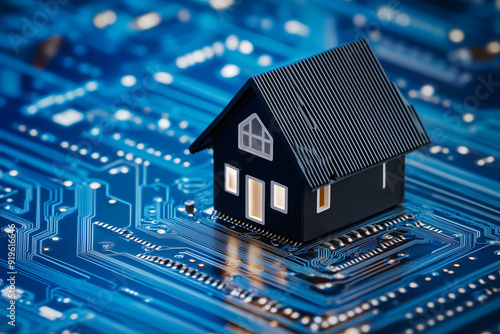 A small house made of black plastic stands on an electronic circuit board , creating the concept of smart homes and home security systems.