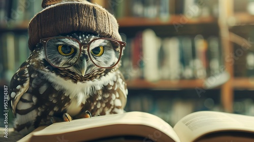 A small owl studies in a current modern library while having chic glasses and a headgear