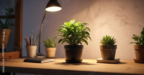A small potted plant illuminated by a desk lamp in a tiny house, interior, beam