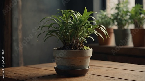 A small potted plant sits atop a wooden table, perfect for decorative or office use.