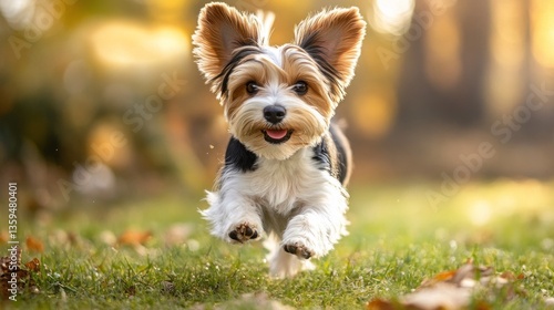 A small puppy with fluffy fur and long ears joyfully dashes across a lush, green field blanketed with colorful autumn leaves. Sunlight pours in, enhancing the vibrant atmosphere