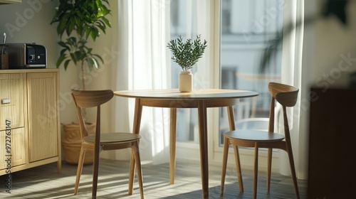 A small, round dining table with a retractable leaf, surrounded by minimalist wooden chairs