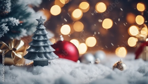 A small silver tree with a star on top sits on top of a snowy ground. The tree is surrounded by a bunch of red and white balls, which are scattered around it. The scene has a festive and joyful mood