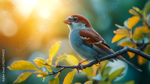 A small sparrow perched on a branch with soft sunlight shining through the leaves.