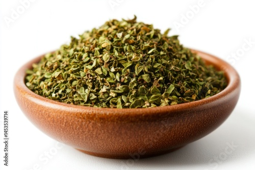 A small, wooden bowl is filled with dried, green herbs and placed on a white surface