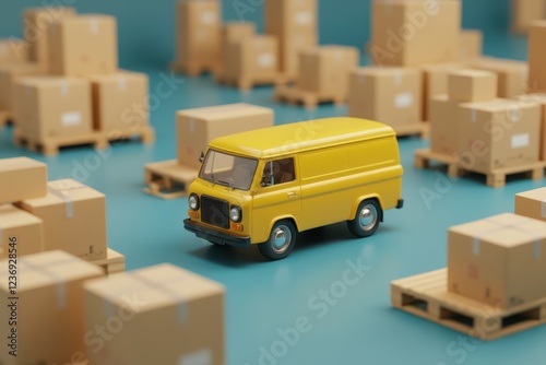 a small yellow van is driving through a warehouse