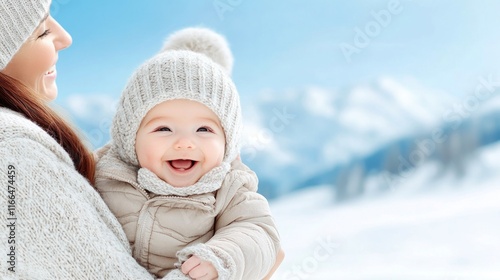 A smiling baby in a cozy outfit, held by a smiling woman in winter.