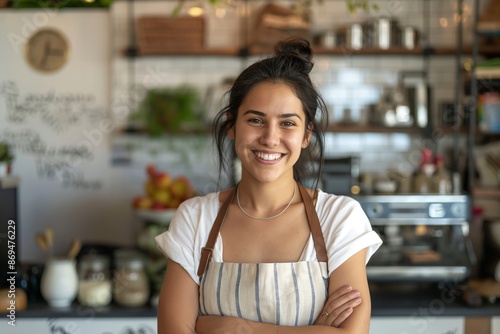 A smiling barista wearing an apron stands confidently in a modern cafe kitchen surrounded by equipment.