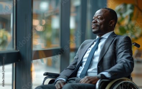 A smiling Black businesswoman, wearing a black blazer, sits in a wheelchair inside a modern, well-lit lobby