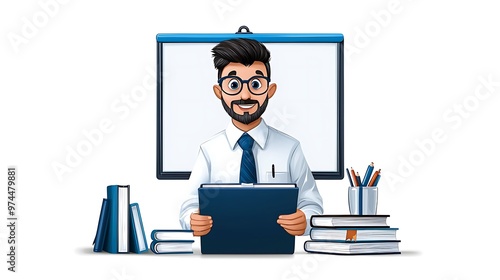 A smiling businessman stands confidently with a clipboard, books, and a whiteboard, ready to take on the day.